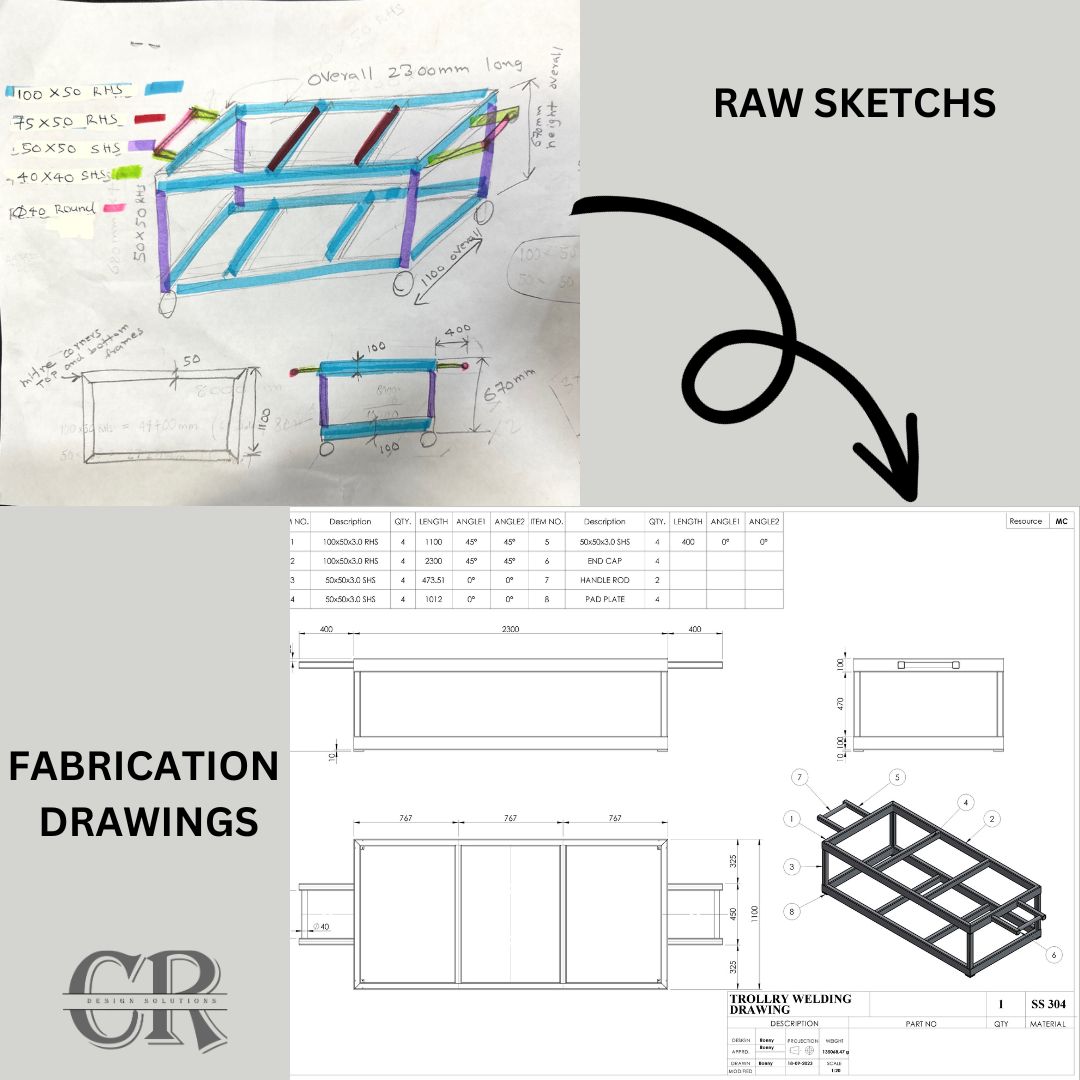 The client requested an trolley fabrication drawings, their main concern was the trolley should not exceed 3200 mm length(including handles), 1150 mm width and 850 mm ht including wheels Ht. The dynamic weight carrying capacity should be 90 kgs, so we selected heavy duty castor wheels from samart catalogue with adequate weight carrying capacity. Initially we produced an hand sketched drawings of the trolley while discussiong the requirements and furthur produced the Fabrication Drawings.